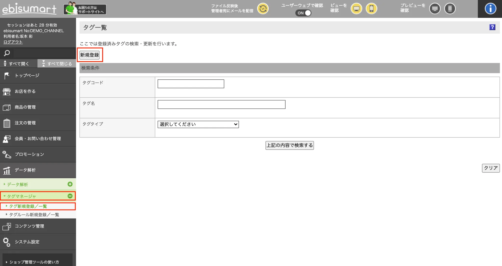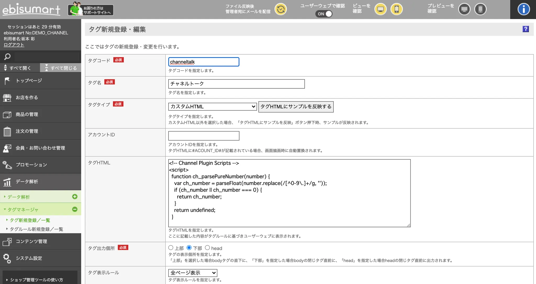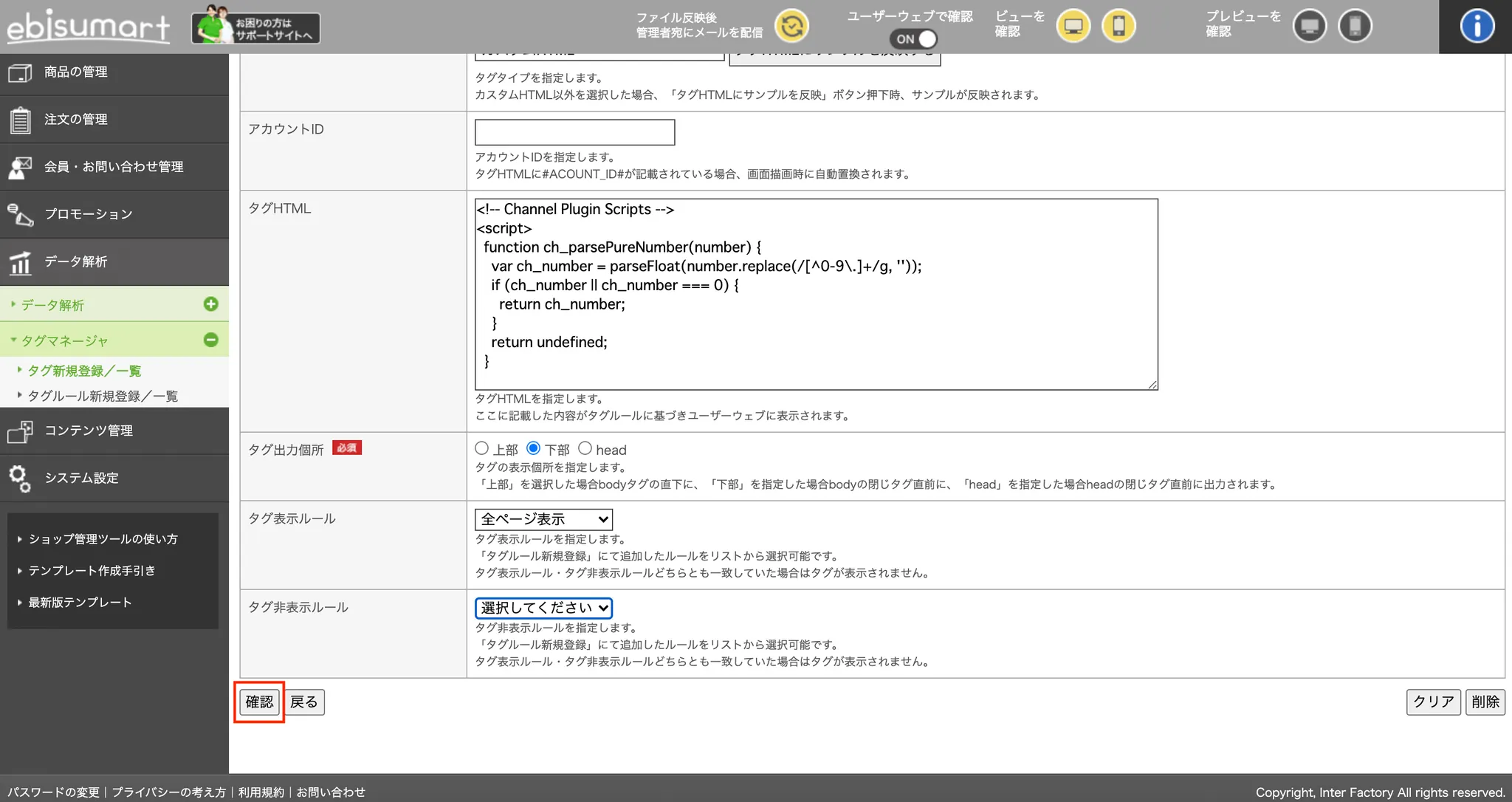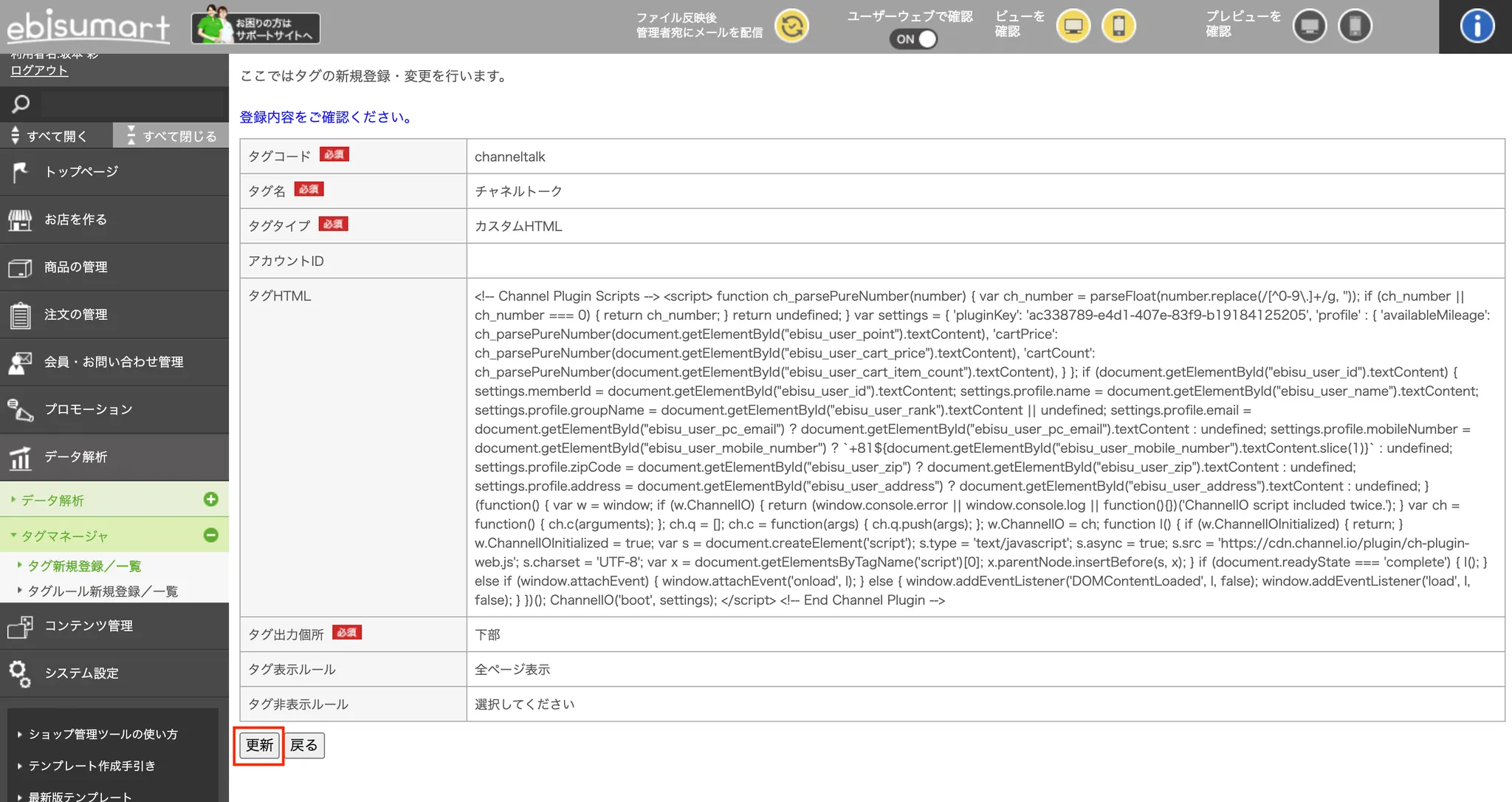 3. ebisumartの管理画面にログインして、タグマネージャで先ほどのタグを設置しましょう