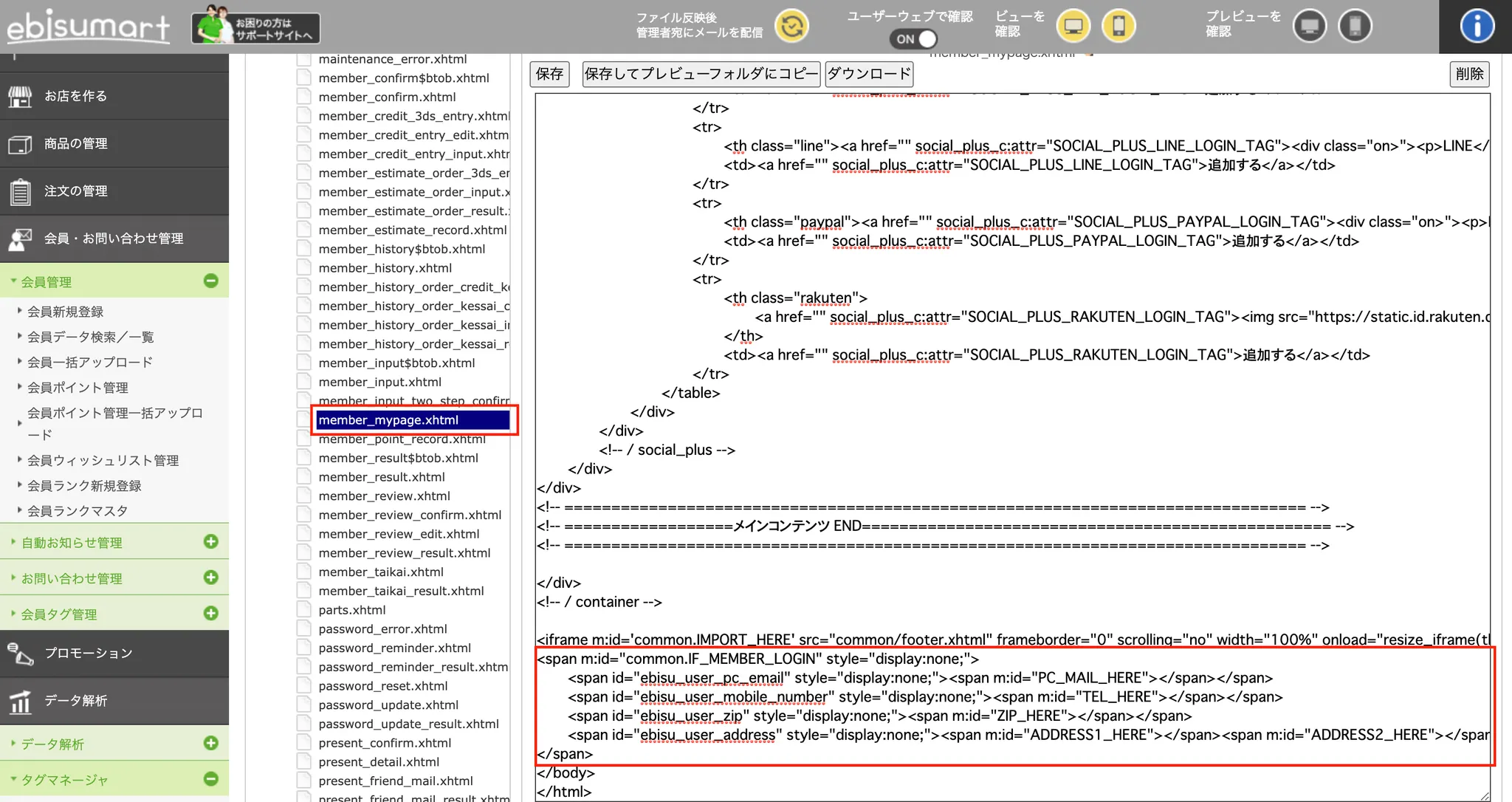 4-6. member_mypage.xhtmlのファイルに移動して、コードの一番下までスクロールしましょう。以下を参考にしながら、</body>と書かれている手前の行に先ほどのコードをペースとします! 保存してプレビューフォルダにコピーをクリックして、保存します