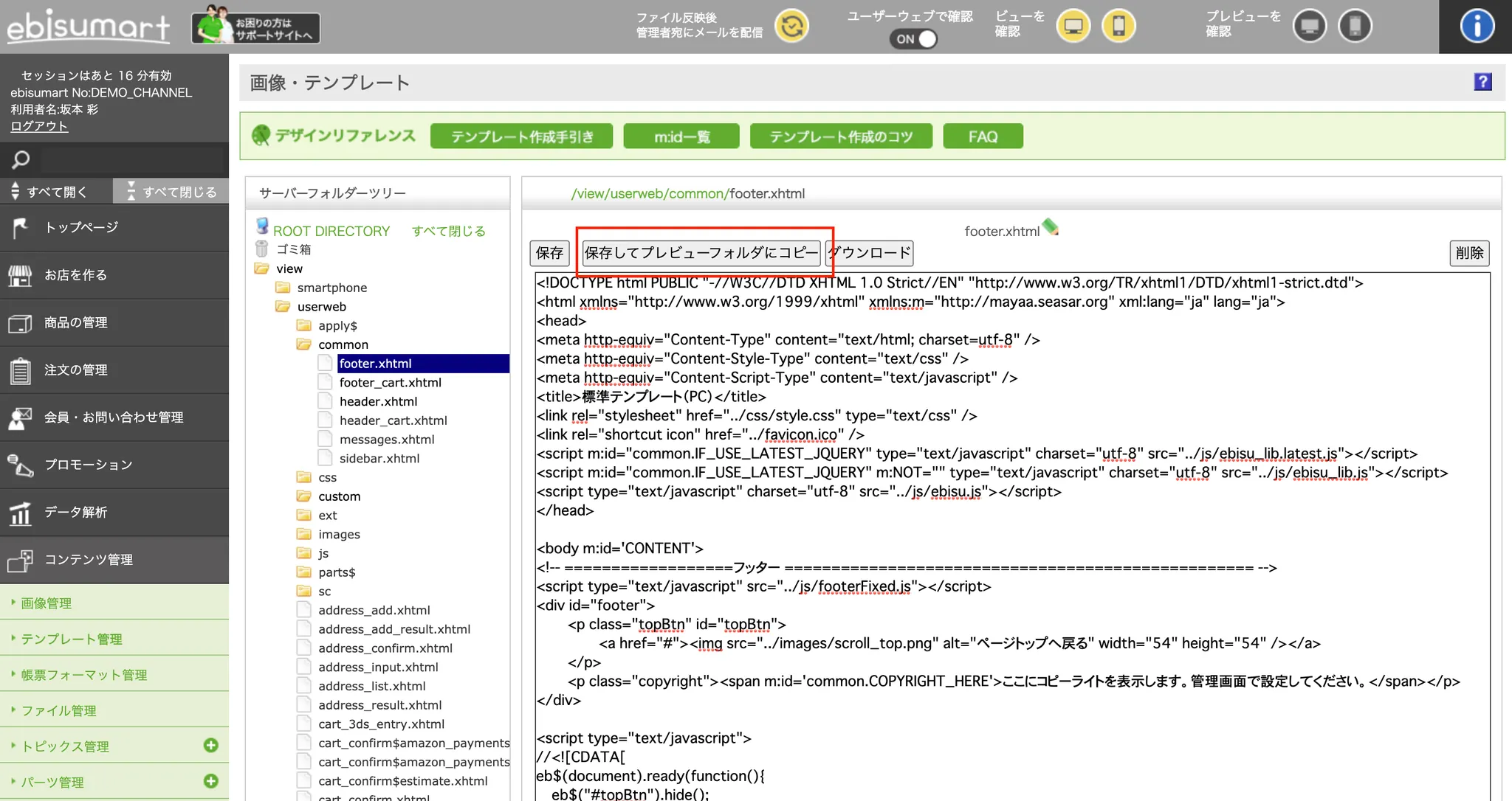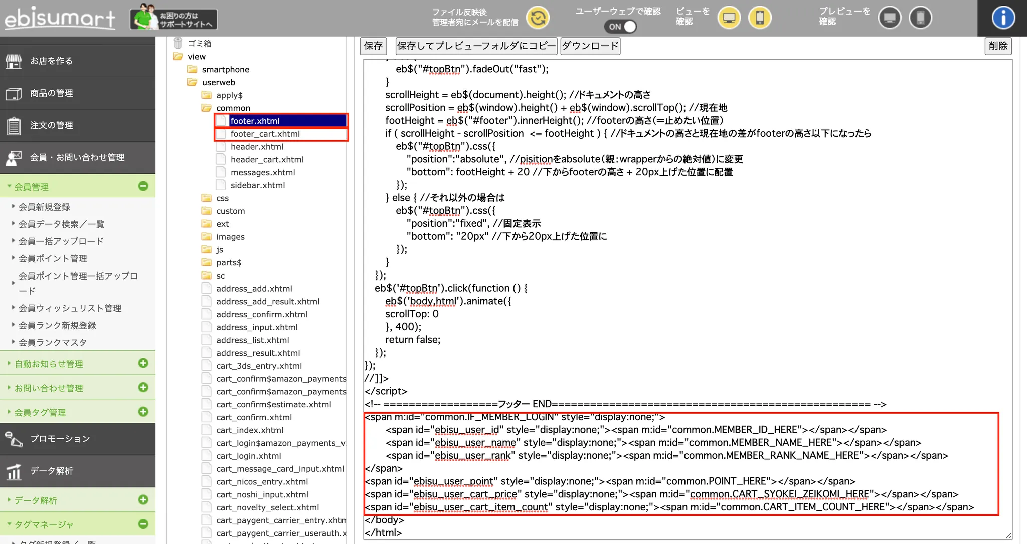 4-4. footer_cart.xhtmlファイルに移動して、3. の手順とまったく同じようにコードを追加・保存してプレビューフォルダにコピーをします!