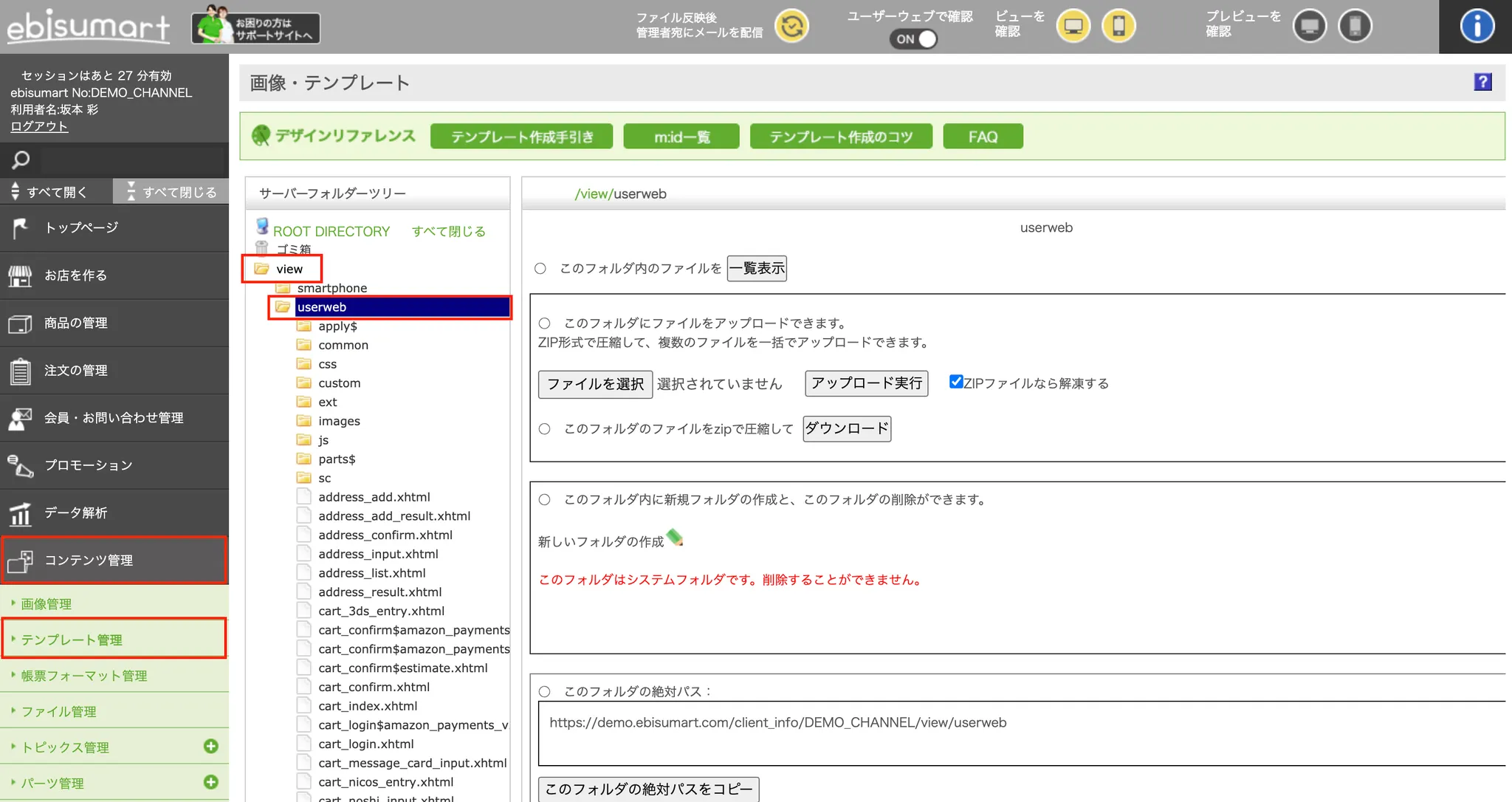 4-1. コンテンツ管理 > テンプレート管理> view > userwebをクリックして、パソコン画面のテンプレートファイルをカスタマイズしていきます!