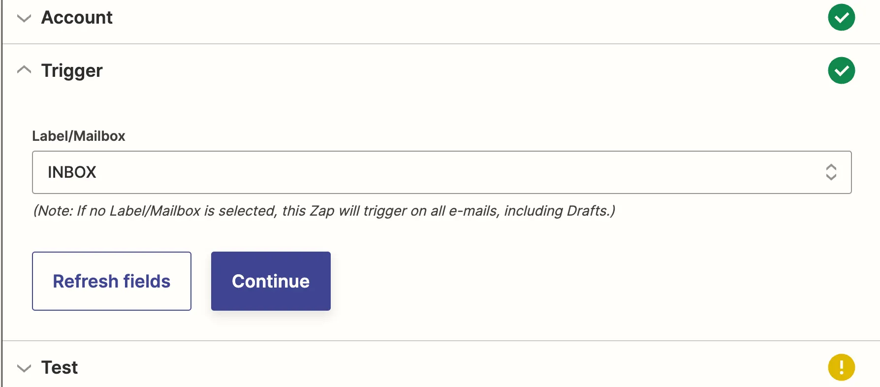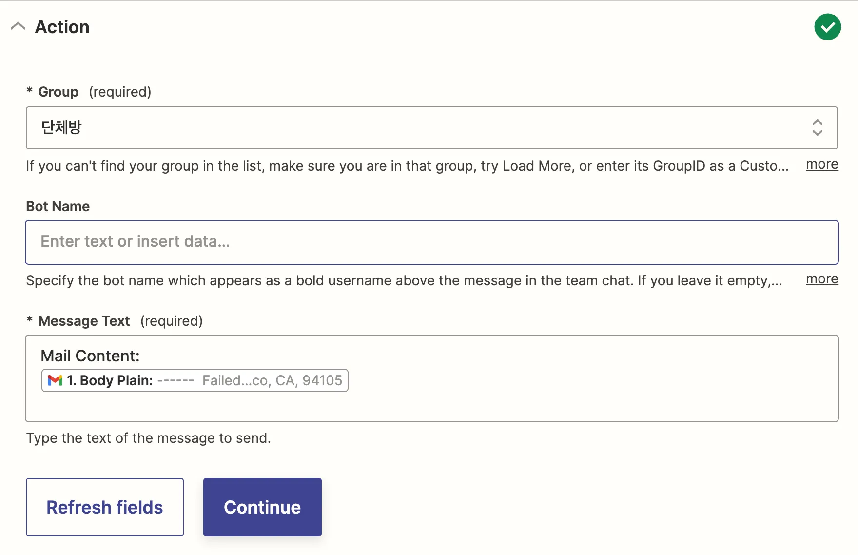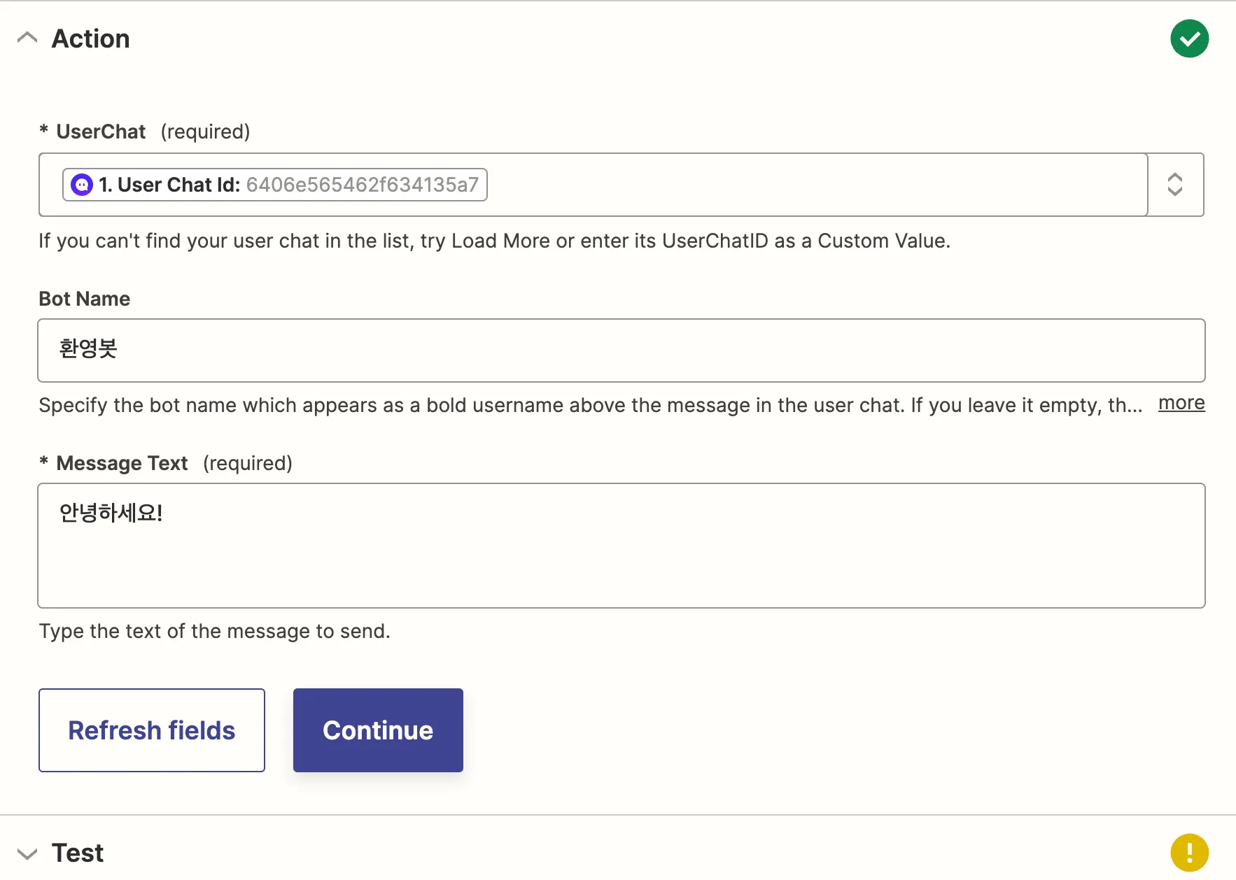 Testがうまくいくか確認した後、Continueを押してから次のアクションを設定します。