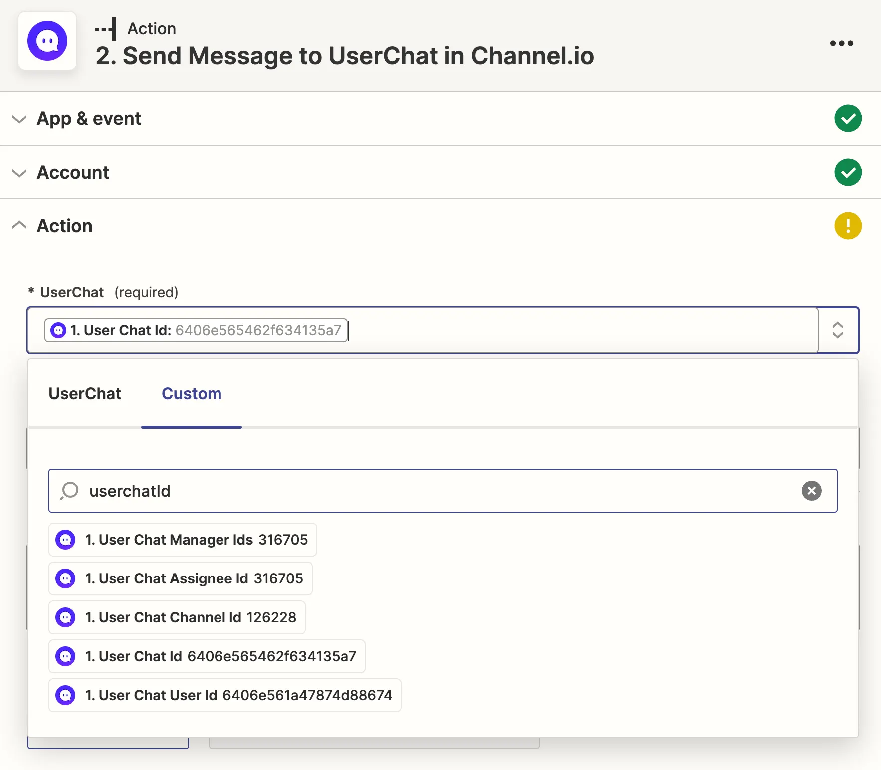 この例では、接客チャットが新たに流入するたびにメッセージを送信するので、前のTriggerから受け取った接客チャットId値を活用します。