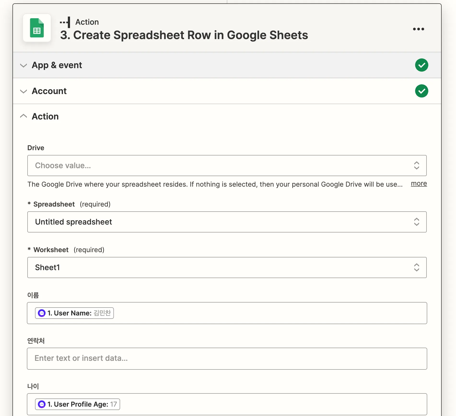 その後、ワークフローのフォームから入力された情報を保存するアクション(ex.スプレッドシートにRow作成など)を追加します。