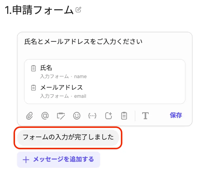 申請通知を受けるワークフローのフォームメッセージを作成し、赤い四角形のメッセージのようにフォーム入力後に表示されるメッセージを設定します。