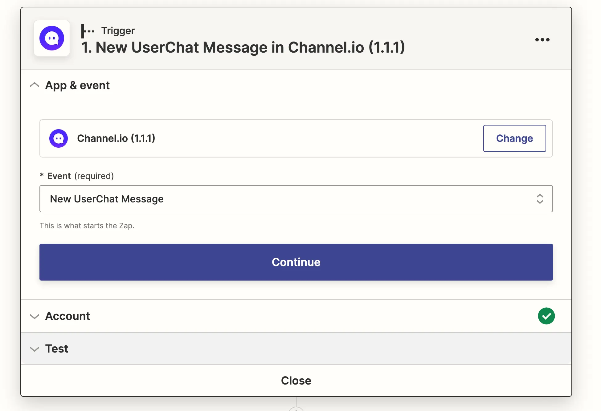 Create Zapを押して、TriggerをNew User Chat Messageに設定します。
