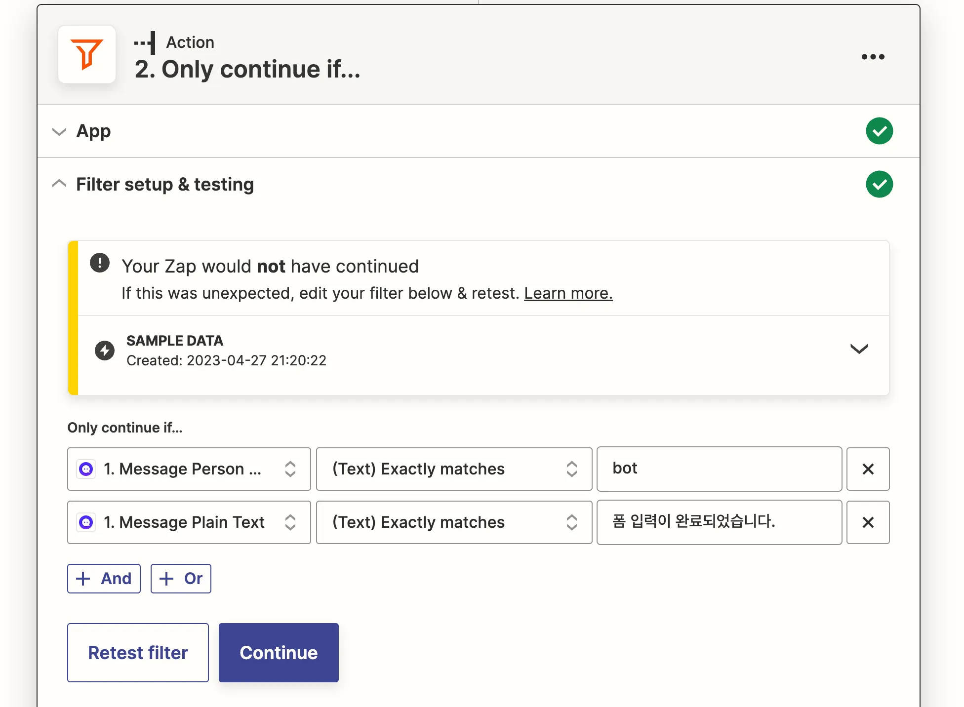 該当のメッセージテキストを任意に設定した後(例写真では"フォームの入力が完了しました"と設定しました)、このテキストを Zapier FilterのMessage Plain Text 条件に設定します。