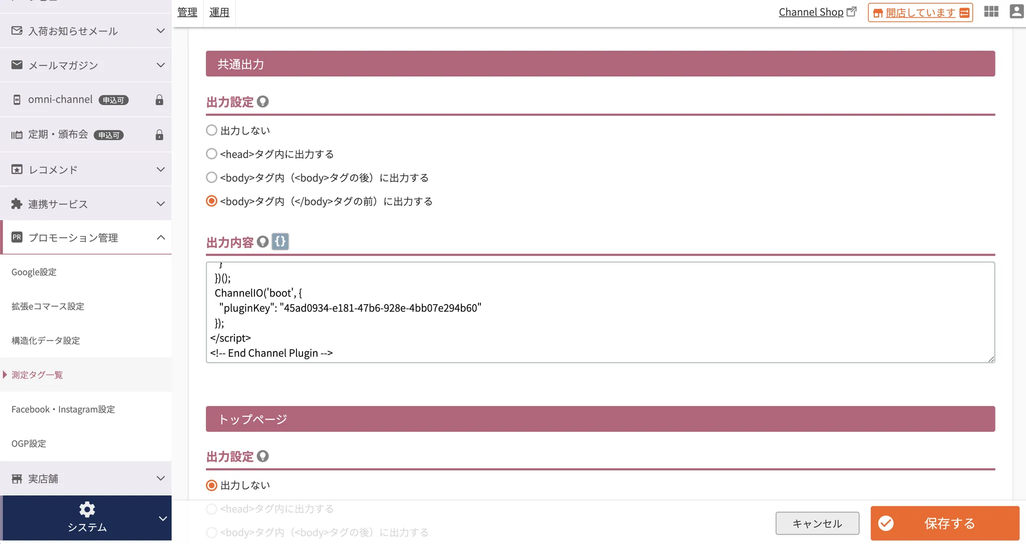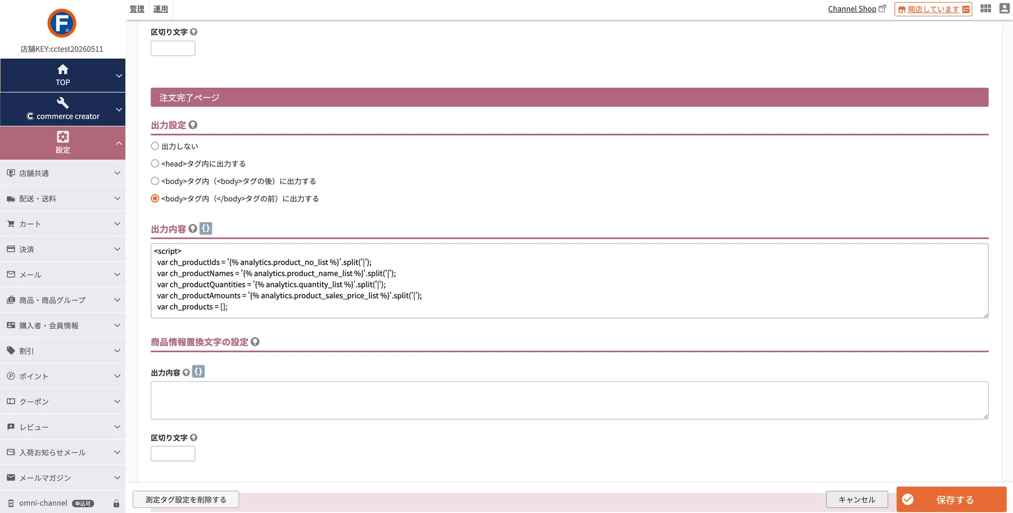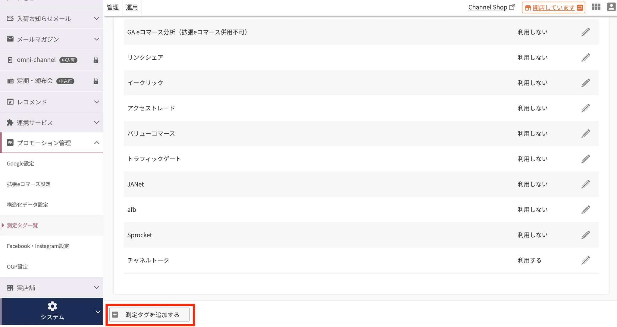 コマースクリエーターより、設定 > プロモーション管理 > 測定タグ一覧 のページに移動してください