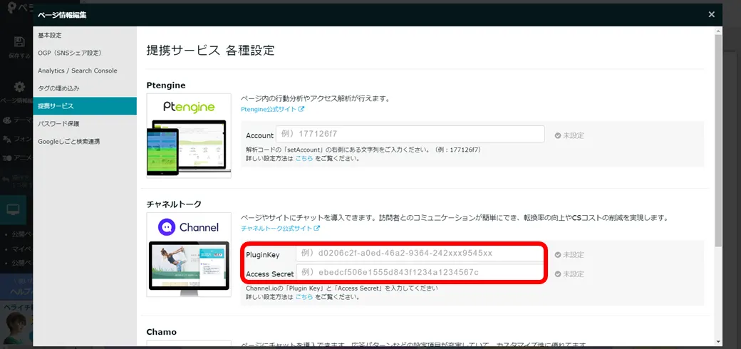「提携サービス」のタブからチャネルトークの"Plugin Key"と"Access Secret"を入力してください!