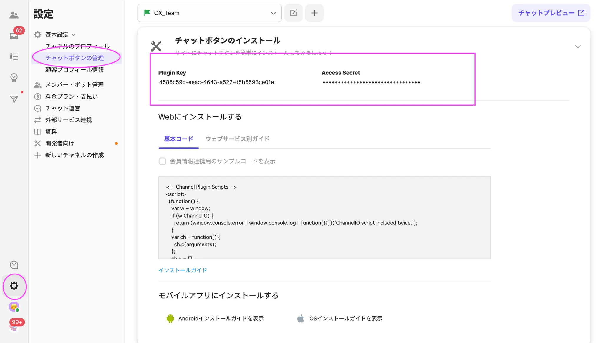 チャネルの設定 → チャットボタンの管理 → チャットボタンのインストールの順にクリックし、"Plugin Key"と"Access Secret"をコピーします