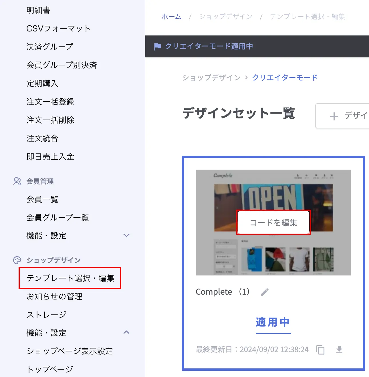 1. ショップデザイン - テンプレート選択・編集 - コードを編集