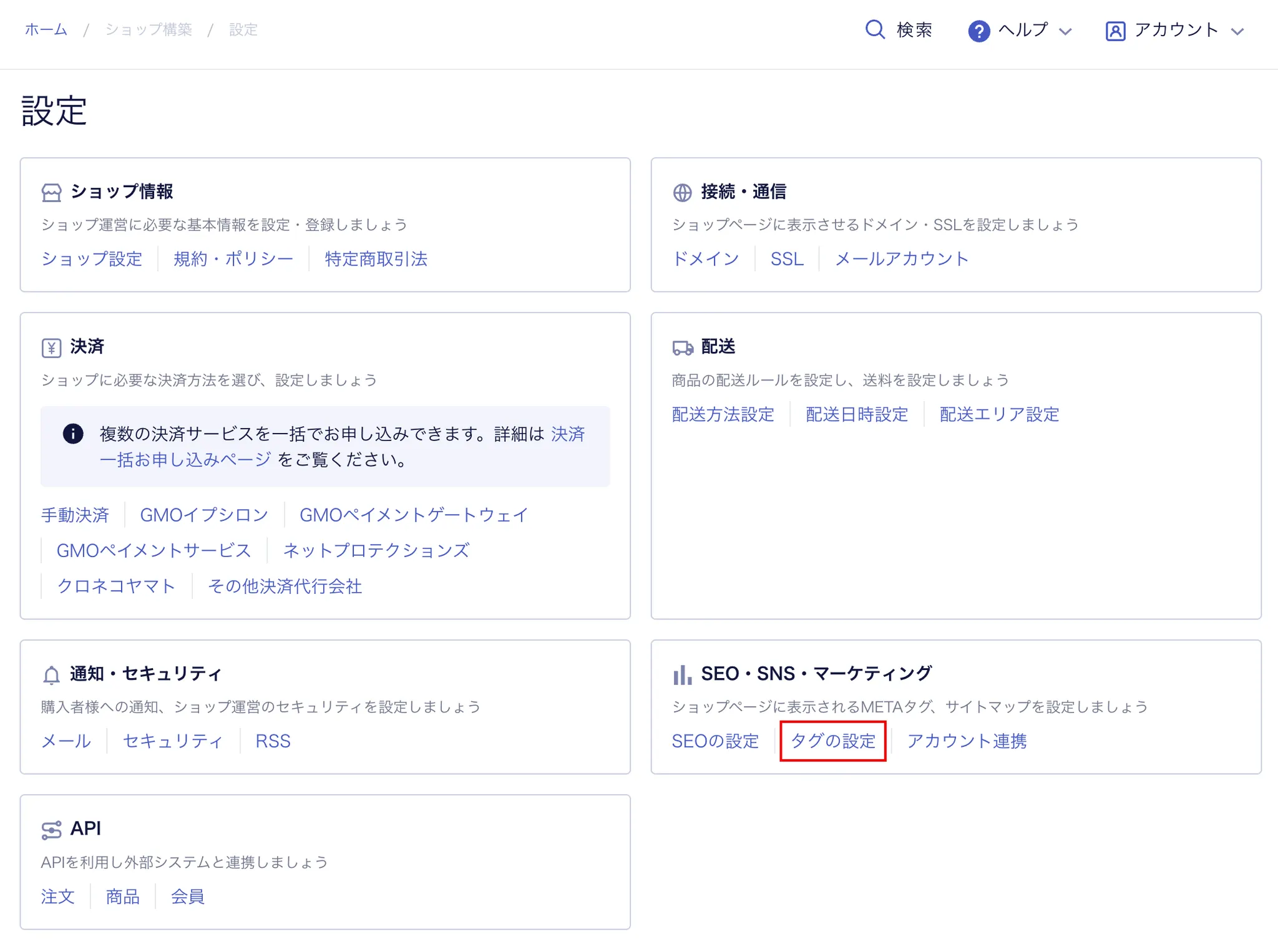 SEO・SNS・マーケティング - タグの設定で「タグの設定」を選択してください。