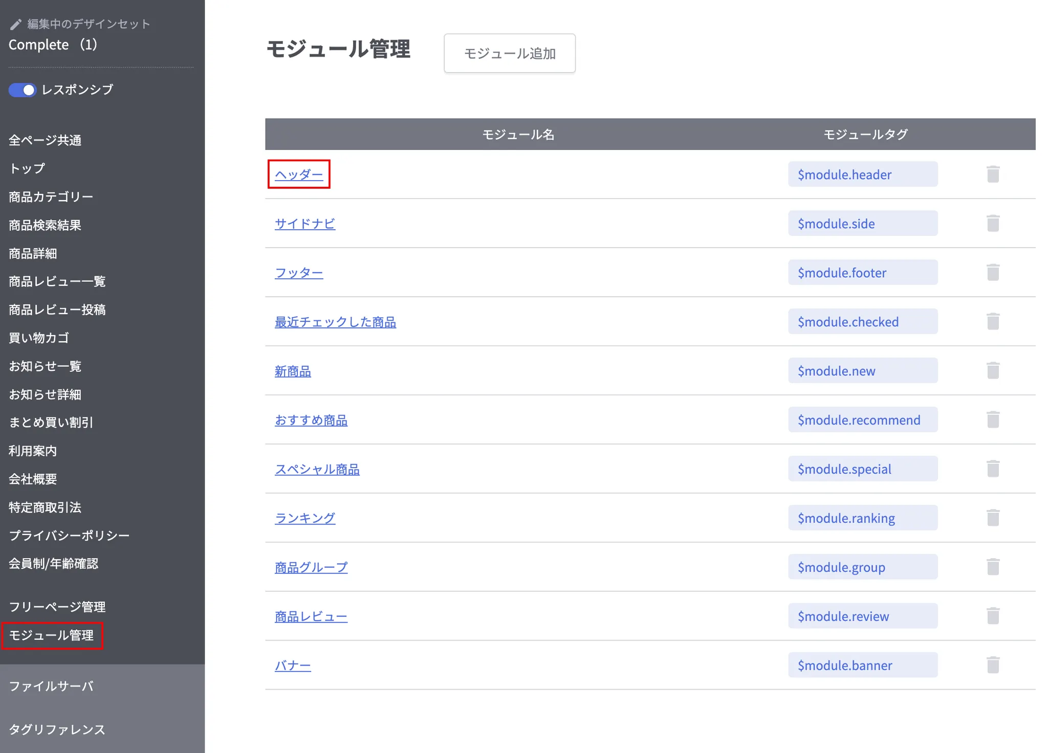 モジュール管理でヘッダーを選択してください。